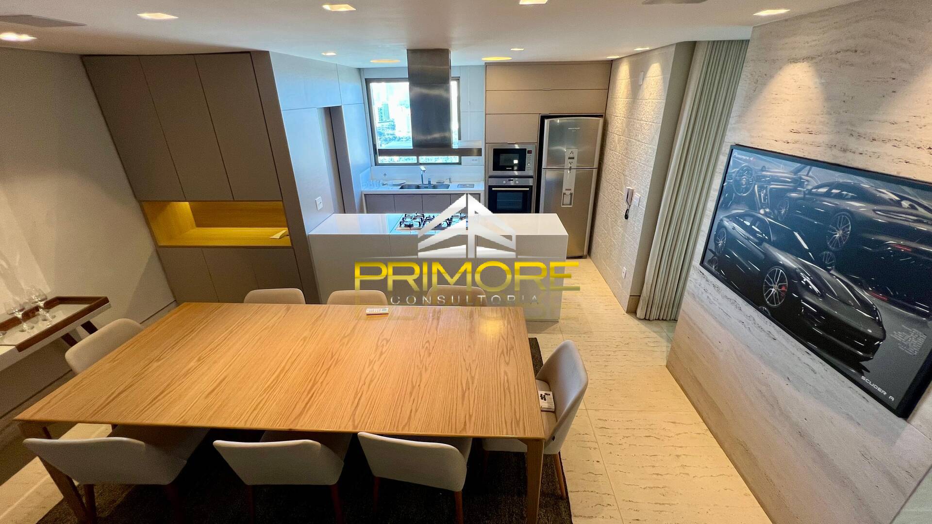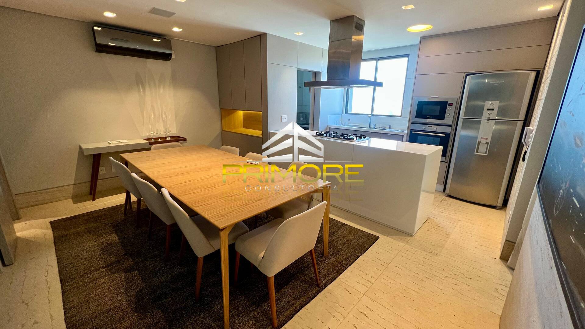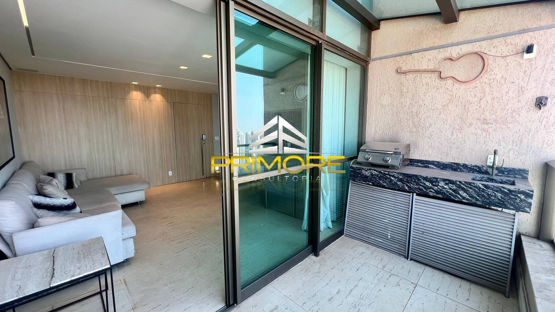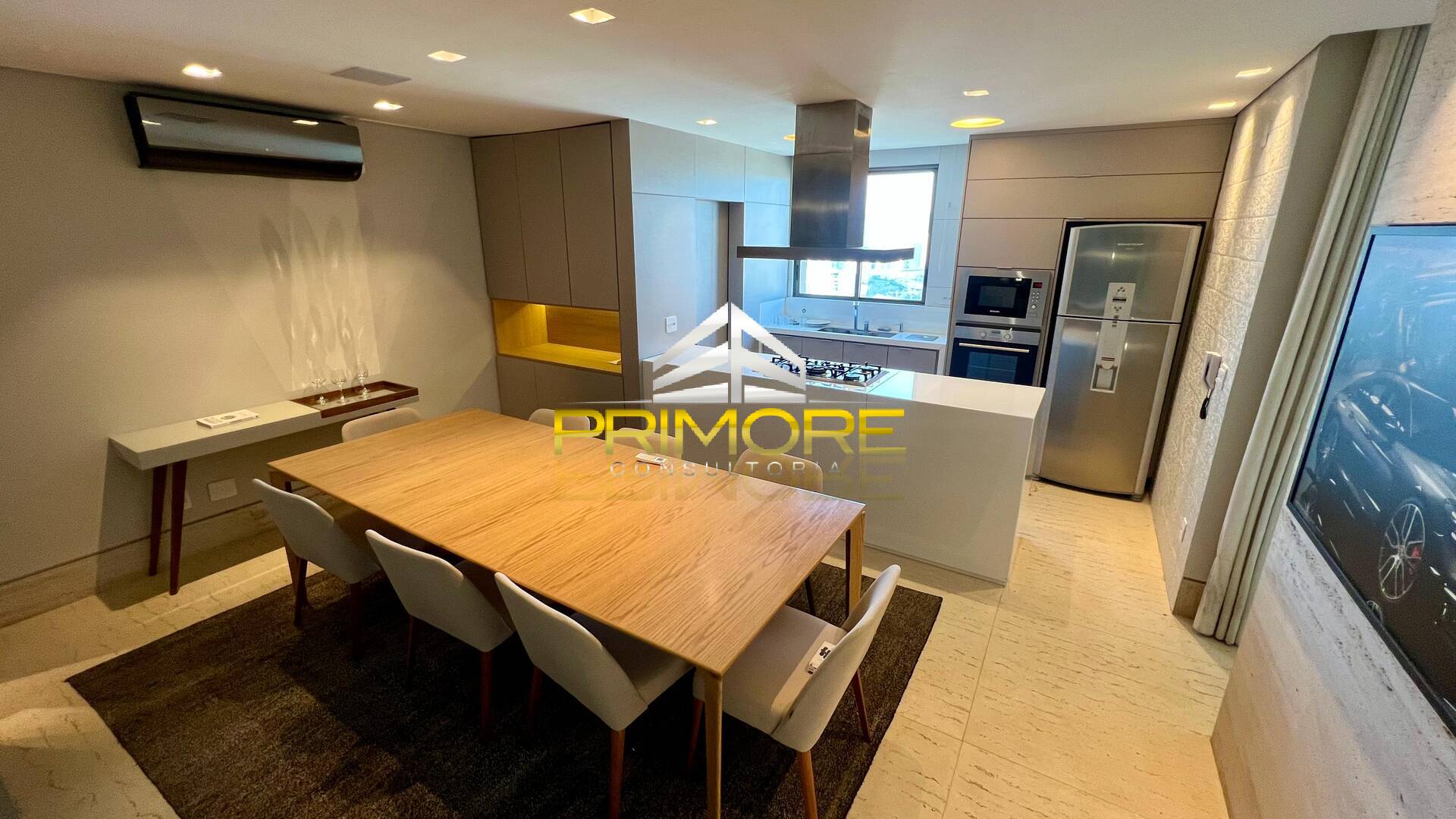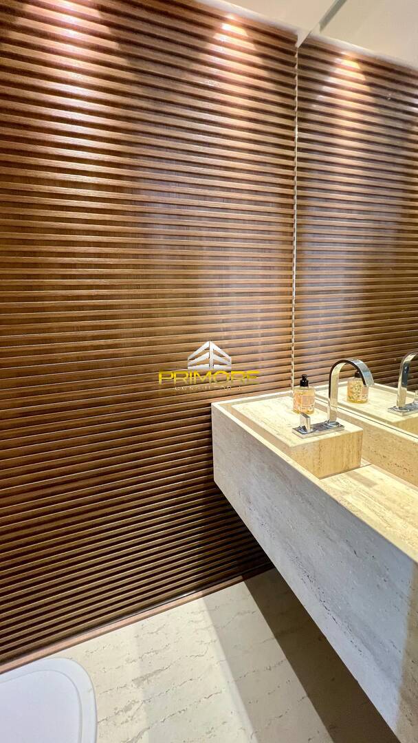 Sala de jantar climatizada; Sala de estar, com linda vista;Varanda gourmet;Cozinha toda equipada, em estilo americano;Lavabo decorado;
