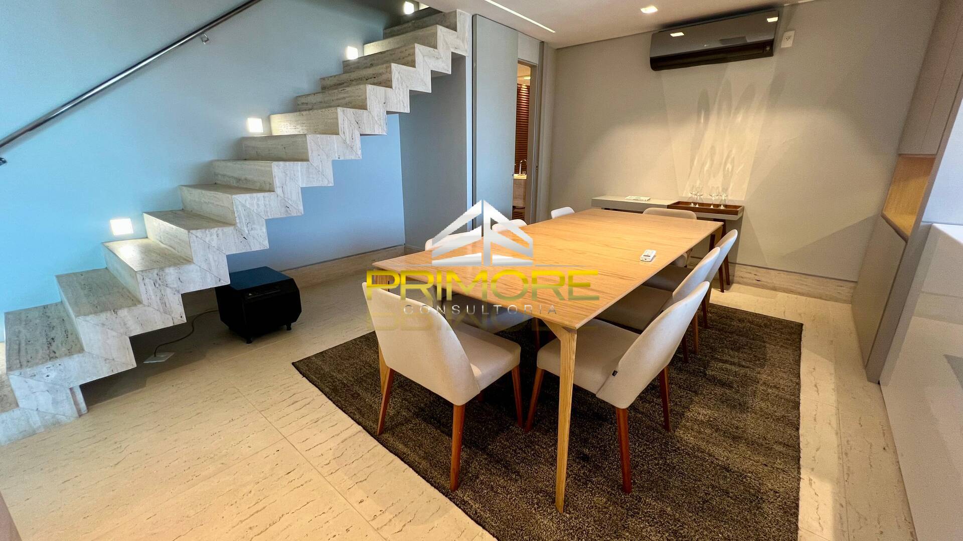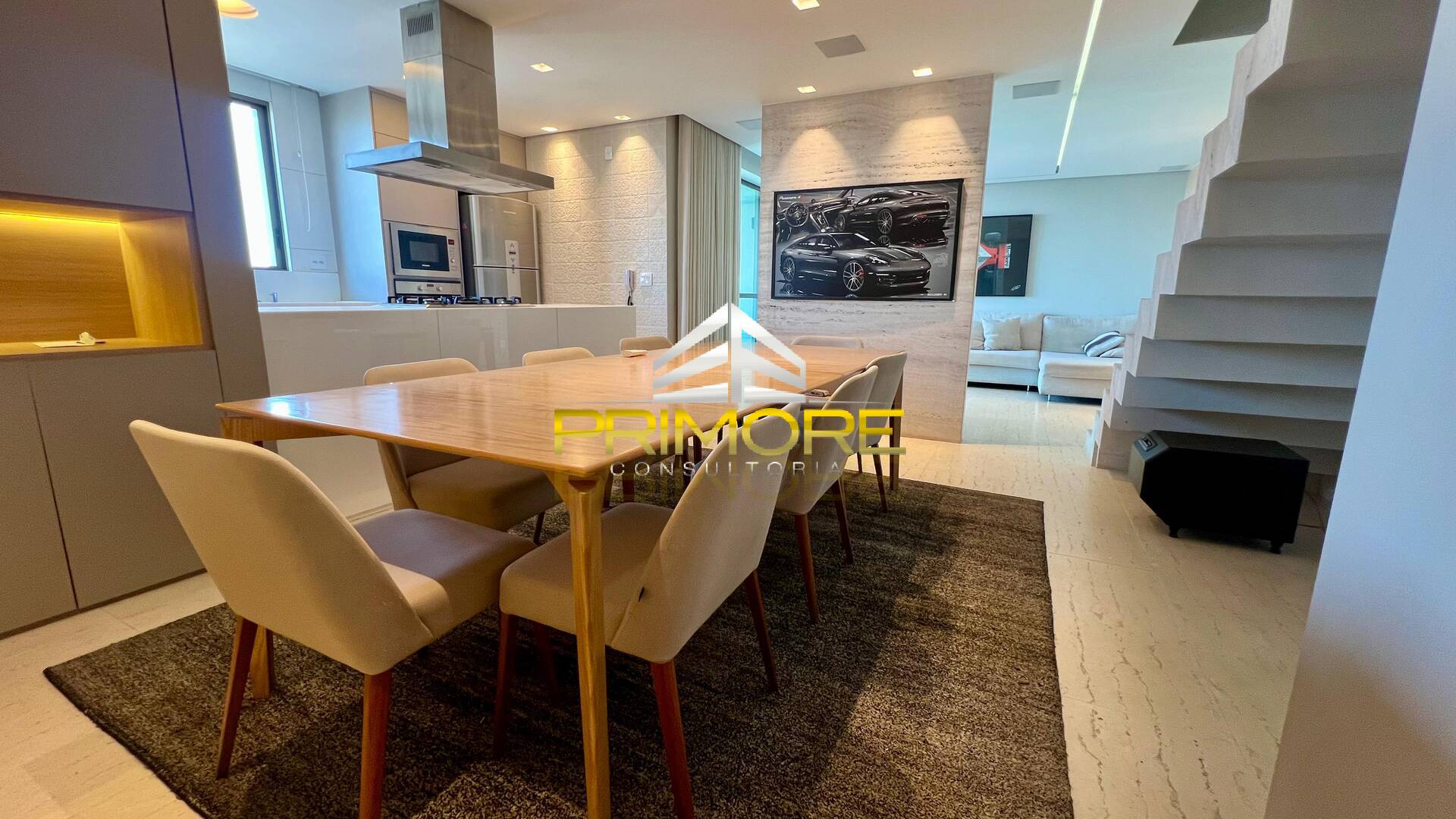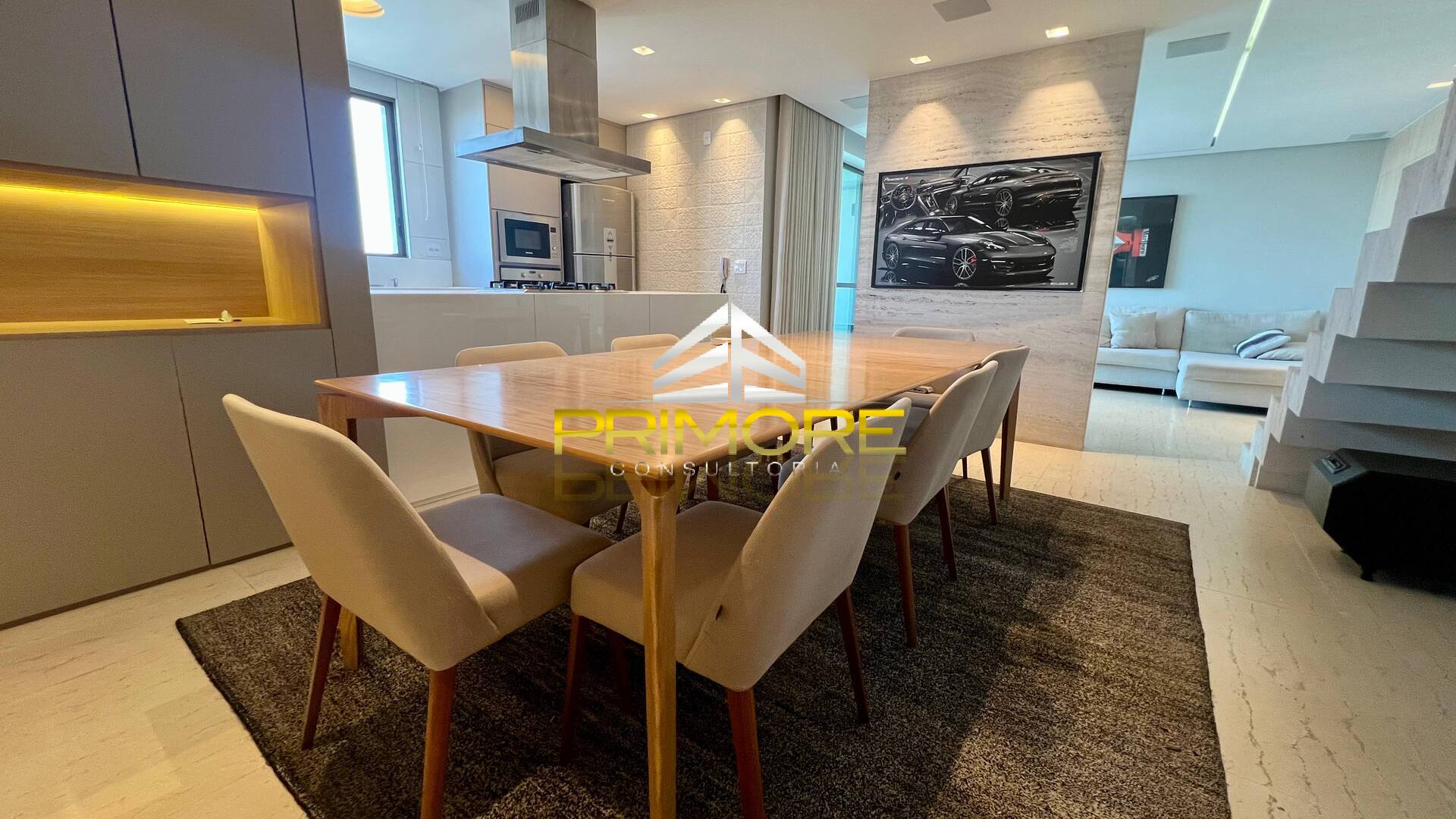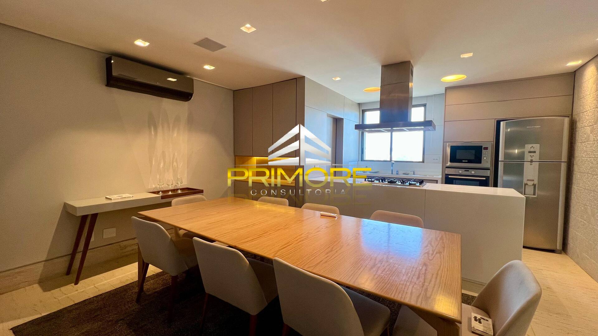 Sala de jantar climatizada; Sala de estar, com linda vista;Varanda gourmet;Cozinha toda equipada, em estilo americano;Lavabo decorado;